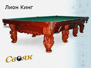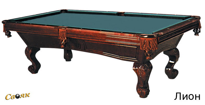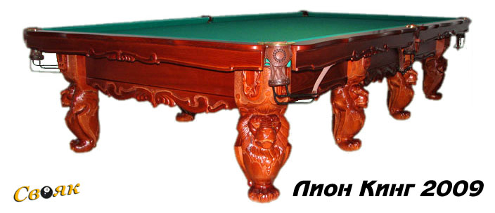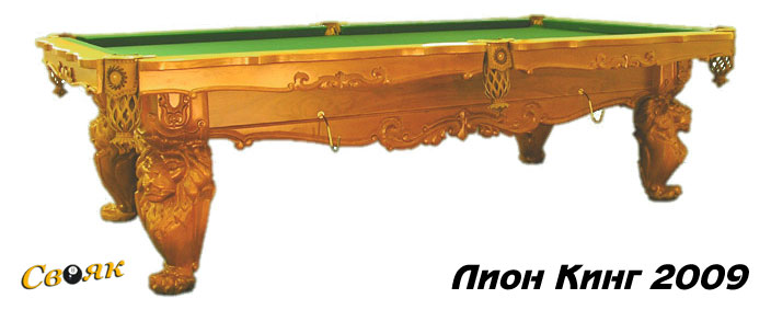 Чрезвычайно интересная, аристократическая модель стола. Ножки стола выполнены в виде львов (ручная работа) без подпятников, что улучшает игровые качества стола. Царги прямые, отделаны по краям ручной резьбой. Изготавливается разных размеров: от 9 до 12 футов из натурального дерева твёрдой породы — ясень, бук, дуб на 8-ми, 6-ти, 4-х ногах (в зависимости от размера). Внешний вид стола оценят настоящие ценители и любители ручной обработки древесины. В основании игрового поля использована плита из природного камня ардезия (производства Италии). Сукно — ведущей бельгийской фирмы Ivan Simonis. Лузы в столах — латунные (высококачественное литье под давлением) с кожаным карманом с фартуком. Стол комплектуется профессиональной резиной. Широкая цветовая гамма природных тонов. Предлагается комплектация аксессуарами ведущих мировых производителей. Полностью отвечает требованиям Национальной Федерации бильярдного спорта к турнирным бильярдным столам. Предназначен для клубного и домашнего использования.